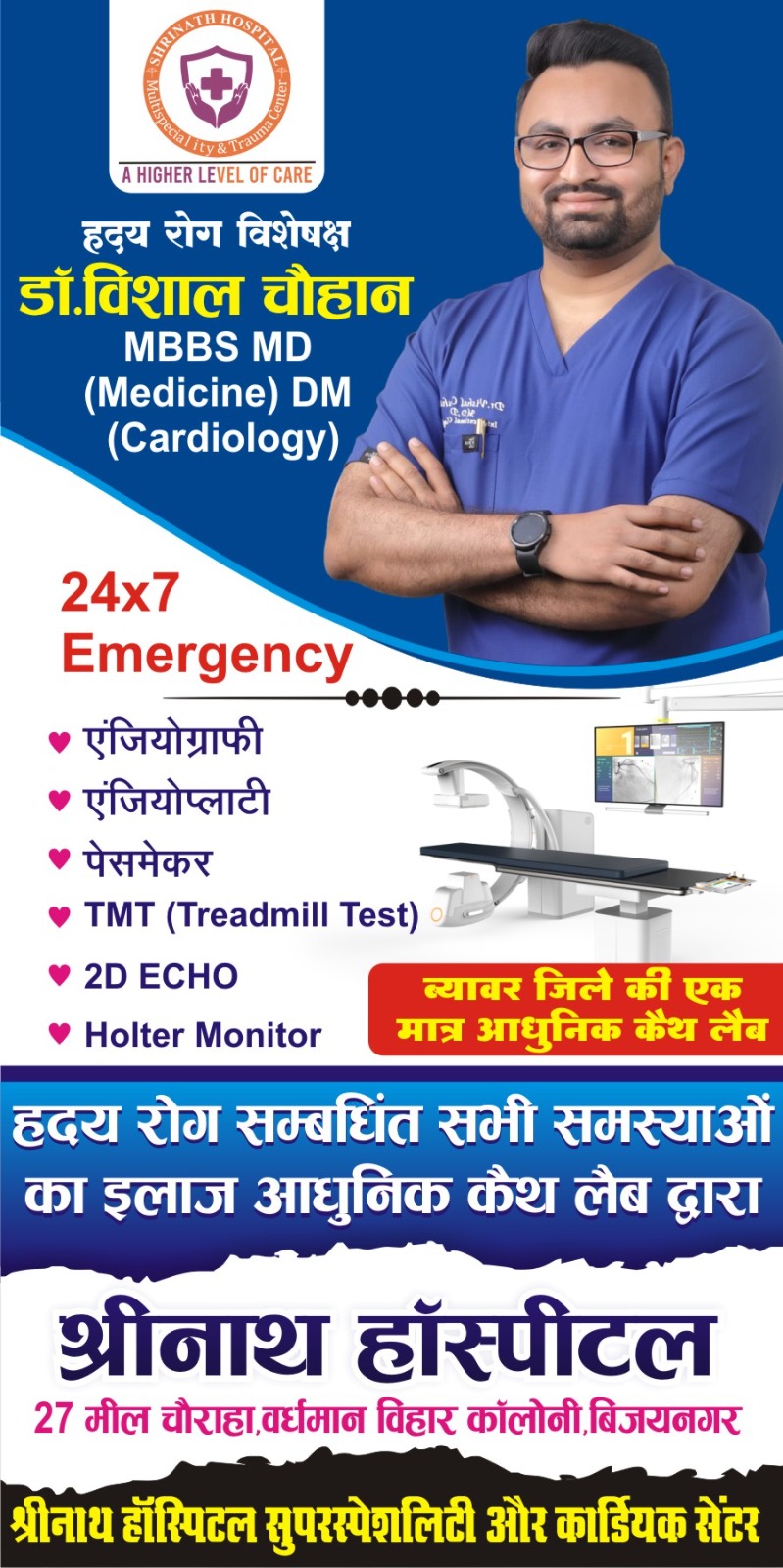 Shrinath Hospital (Multispeciality & Trauma Centre) is located at 27 Mile Chouraha, Vardhaman Vihar Colony, Bijainagar District, Beawar Rajasthan. This hospital is the largest 100 bedded multispecialty hospital in the district.